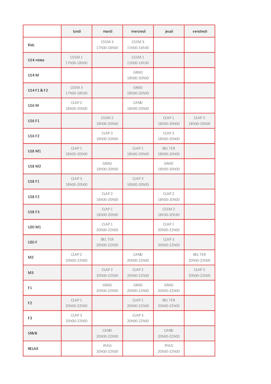 Les horaires peuvent fluctuer de 15 minutes en fonction des entraineurs.