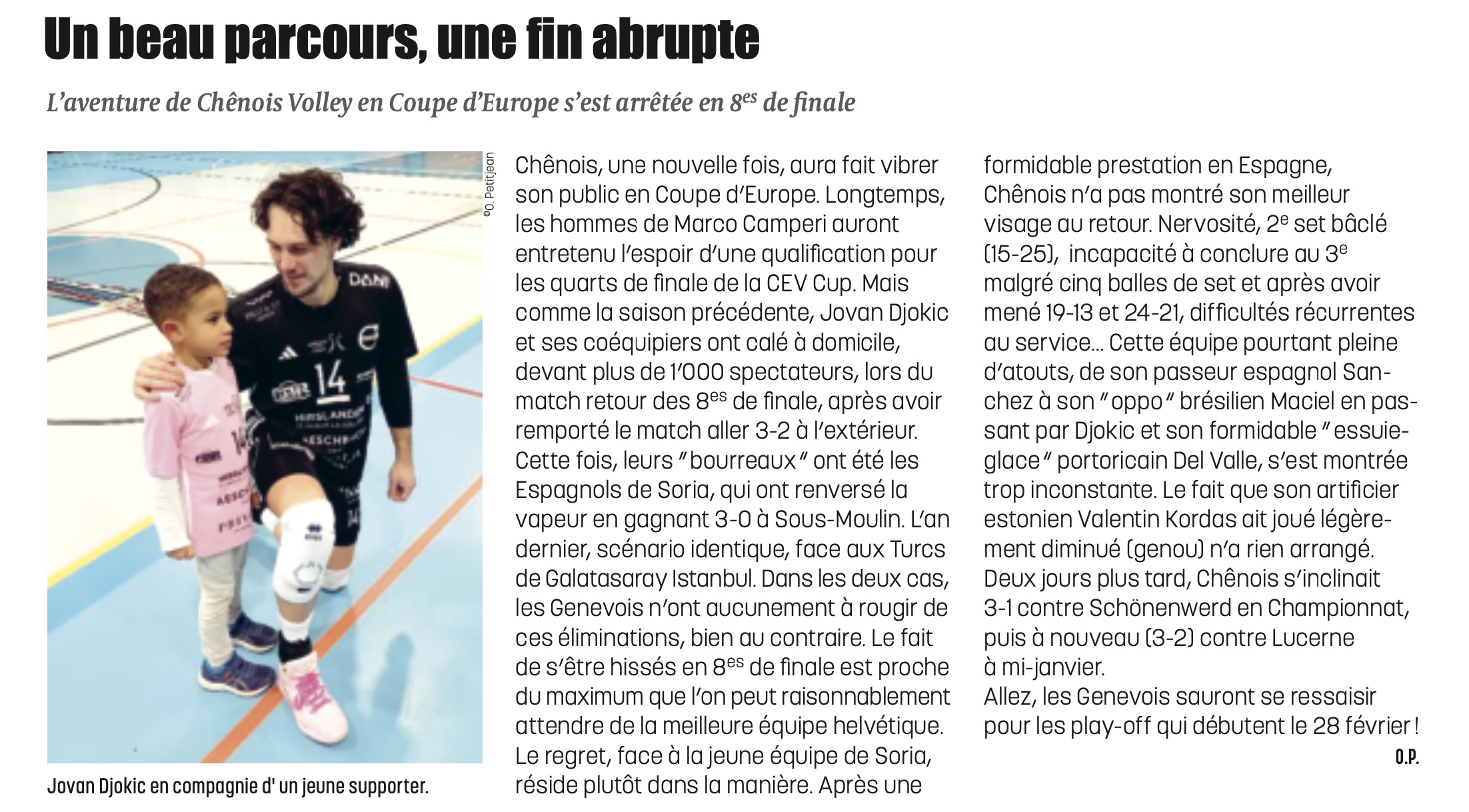 Un beau parcours, une fin abrupte 1 Fév 2024 | Actualités, News Article L’aventure de Chênois Volley en Coupe d’Europe … Cliquez ici pour plus d’infos